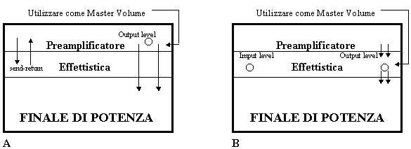 Se invece gli effetti sono in serie dopo il pre (si definisce sistema a cascata), l'output level dell'ultima apparecchiatura nel percorso del segnale avrà il controllo del volume globale (grafico B).