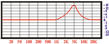 Il grafico illustra chiaramente la situazione che si è venuta a creare: sia i 2Khz che i 10Khz sono stati inevitabilmente incrementati di circa 3db. Tale situazione viene definita campana (la forma geometrica nel grafico ne indica il motivo) o Q o Bandwidht