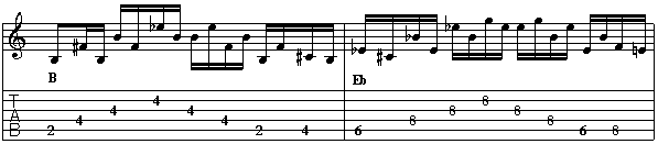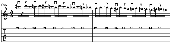 Vediamo un altro procedimento simile, usato questa volta da Edward Van Halen nel Live "Right Here, right now" (1991) dei Van Halen. La parte in questione è all'interno del brano "316". In questo punto il tempo di metronomo è di Quarto=116, e anche stavolta la ripetizione è sull'ultimo sedicesimo: