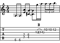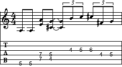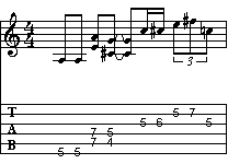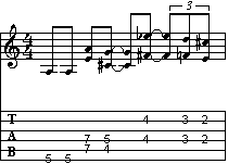 Proseguiamo il discorso iniziato nella pagina precedente. In questo caso trattiamo un sistema molto interessante sotto il profilo didattico. Infatti ogni esempio, costituito da una sola misura su di una base armonica di A7, sviluppa una sezione suddivisa in due parti. Nella prima parte della battuta troviamo un riff sui bicordi (che sarà sempre lo stesso per tutti gli esempi), mentre nella seconda parte una frase che di volta in volta sarà costruita in modo diverso. L'utilità di questo sistema di studio è quella di mettere in relazione differenti modi di intendere il fraseggio paragonati ad una frase fissa.