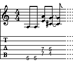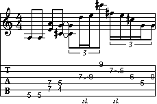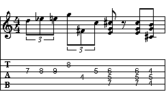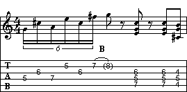 Analizziamo il riff che viene suonato nella prima parte di ogni battuta. Prevede un gioco di due bicordi in A, il primo in posizione fondamentale ed il secondo in stato di rivolto, ai quali viene aggiunta una coppia di note (C# e G) che enfatizzano l'accordo di A7. Questa ultima coppia non è definibile come bicordo, in quanto composta da terza e settima minore (calcolate in relazione alla nota A, tonica dell'accordo di A7, secondo la regola degli intervalli). Ricordate che la ritmica è shuffle, e quindi gli ottavi sono da suonarsi terzinati.