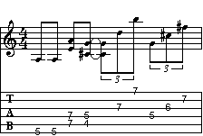 Adesso mettiamo al contrario il sistema. In pratica abbiamo un nuovo riff, lavorato ad accordi (A7 e A7/9, sempre sulla base di A7), che però segue la frase. La tecnica e il modo di esecuzione rispecchiano quelli già visti nella serie di esercizi precedenti.