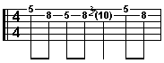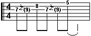 Ovviamente questo era solo un esempio che però dovrebbe essere seguito ogni qualvolta ci si imbatta in un bending da eseguire su di una nota suonata dal 4° dito. Possiamo comunque imbatterci in altri tipi di bending, come nel seguente caso, dove ad una corda tirata viene affiancata una nota posta su di una altra corda.