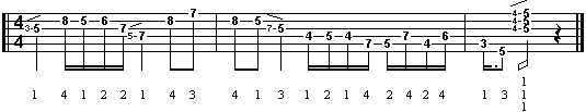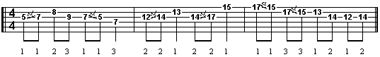 Nella prima battuta vediamo il classico esempio di slide che prevede il passaggio da una nota bassa ad una più alta di un tono. Per ottenere l'effetto con la massima precisione occorre fare in modo che il dito che una volta suonata la nota al 5° tasto, il dito che la preme scivoli fino al 7°, senza comunque staccarsi dalla corda e, soprattutto, senza abbandonare la pressione sulla corda. Il risultato sarà quello di una nota che sale di intonazione facendone sentire anche i passaggi intermedi (la nota C#), e anche lo stacco dato dai tastini. La nota D al 7° tasto non viene plettrata, in quanto creata dallo stesso slide. Questo viene definito come slide ascendente, mentre quello discendente lo troveremo immediatamente dopo, tra il 7° e il 5° tasto: ovviamente si suona in questo caso solo la nota più acuta. Nelle successive battute potete osservare altri esempi di slide basati sullo stesso sistema, prestando molta attenzione anche alla diteggiatura consigliata.