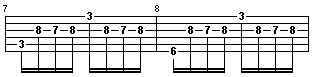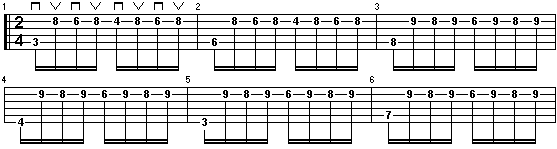 Un altro esempio di string skipping, questa volta posto sulla linea melodica al canto, che riassume una serie di salti di corda. Anche in questo caso è obbligatorio l'uso della pennata alternata.