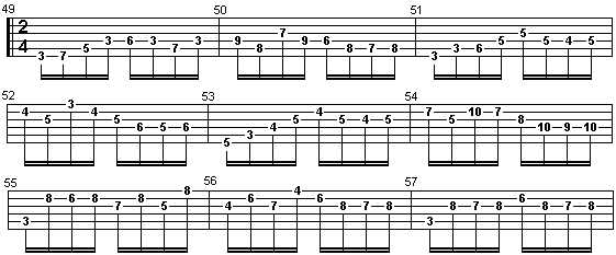 Un cambio completo di situazione lo troviamo a partire dalla battuta 49. Infatti la linea melodica si sposta a lavorare su tutte le corde, partendo dai bassi, in sequenza che viene alternata tra verticale e orizzontale. E' molto interessante lo sviluppo armonico che si viene a creare in questa sezione, che culmina a battuta 57 con la ripresa della linea melodica basata sulla solita tecnica vista nelle battute da 1 a 48.