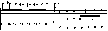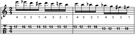 Se analizzate la scala suonata dalla battuta 96 alla 99, noterete che si tratta sempre di una scala cromatica fatta però in questo modo particolare,