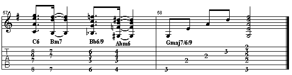 I primi due accordi, C6 e Bm7, a battuta 57, sono interni alla tonalità di G, mentre nel caso di Bb6/9 e di