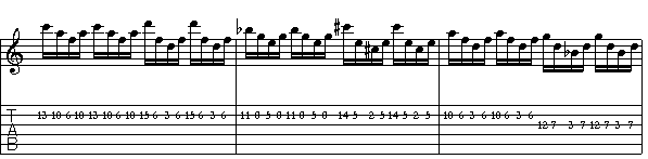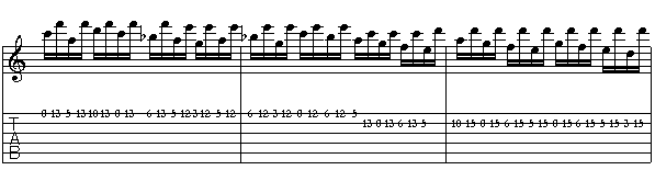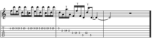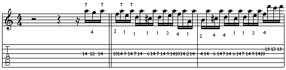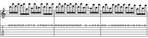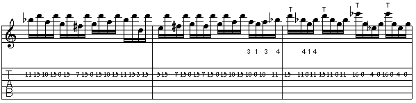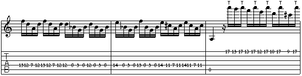 ma utilizza note a gruppi di tre. La prima è suonata dalla mano sinistra, la seconda in tapping che lega di nuovo sulla stessa nota.