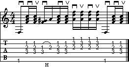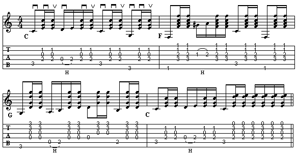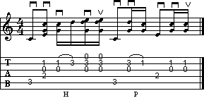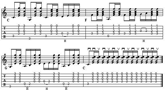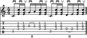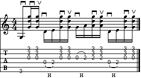 Sempre sull'accordo di C maggiore, utilizziamo la nota A, ottenuta in hammer-on dal G della terza corda a vuoto. Questa ritmica, molto diffusa anche in altri generi musicali (ad esempio, nella musica folkloristica irlandese la troviamo spesso), sviluppa un andamento costante, che, in maniera simpatica, da molti viene definita "saltellante".