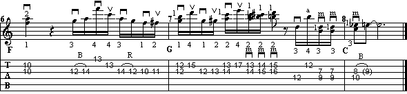 La prima parte della battuta vede una triade di F alla quale vengono aggiunti il VI° e il II° (rispettivamente le note D e G), il tutto giaocato tramite l'uso degli hammer-on. Notare anche l'uso del III° minore (il G#), che conferisce alla parte finale della frase un impronta quasi blues.