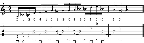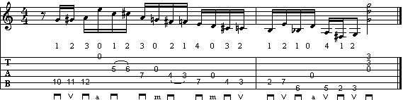 La frase incomincia con un passaggio cromatico che appoggia la tonica (nota A). La nota E della prima corda a vuoto ci permette di cambiare la posizione, scendendo al 5° tasto. Troviamo il classico passaggio terza minore - terza maggiore (in A: C - C#), che cade sulla tonica. Dopo il G a vuoto, un altro passaggio cromatico (note F# - F - E), la cui diteggiatura potrebbe creare qualche problema come impostazione. Troviamo infatti il 1° dito sul F al 3° tasto e il 4° dito sul E al 7° tasto. A fine battuta un altro passaggio cromatico (C# - C - B).