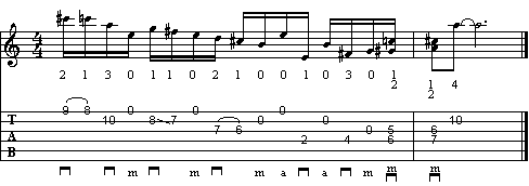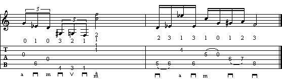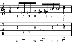Questa è una frase tipica da pennata alternata, a cui è stata sostituita la pennata in su con il dito medio della mano destra. Analizzando armonicamente la frase, troviamo il classico passaggio terza maggiore - terza minore (che nell'esempio in C maggiore sono le note E - Eb). La scalata cromatica finale (note A - Bb - B), prima di terminare sulla tonica C, suona la nota D a vuoto.