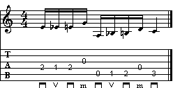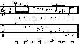 Complichiamoci subito la vita. Troviamo questa volta l'uso dell'hammer-on sul classico terza maggiore - terza minore (E-Eb). Alla terza corda a vuoto (nota G, suonata con il medio della destra) segue un passaggio cromatico in slide tra F# e F. Altro cromatismo, Bb e B (seconda corda a vuoto), che termina sulla coppia di note C-E.