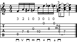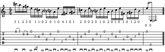 La successione discendente sulle note diteggiate viene intervallata dalle corde a vuoto, che creano la tipica melodia. Attenzione all'arpeggio sul terzo movimento della battuta, che spezza il normale lavoro della destra. Infine trovate due bicordi a terze maggiori, sull'ultimo dei quali viene raddoppiata anche la tonica un'ottava sopra.
