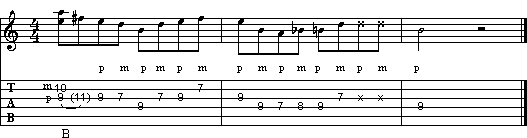 La frase, in D maggiore, viene strutturata nella pentatonica maggiore di D. Dopo il bending iniziale, abbiamo una successione di note suonate da pollice e medio alternati. Le due note stoppate, caratteristiche nel Chicken Picking, rendono il fraseggio più percussivo. Ricordatevi sempre l'uso dello slap per le dita delll mano destra, in questo e negli altri esempi relativi al Chicken Picking.