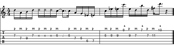 In questo esempio ritroviamo lo slap del medio presente sulle note suonate in alternanza dal pollice e dal medio. Tre gli accordi su cui si basa questo lick, il A (primi due movimenti della prima battuta), il A7 (secondo movimento) e il G (quarto movimento). Nella seconda battuta abbiamo una scalata cromatica sui bassi che finisce di nuovo sull'accordo di A.