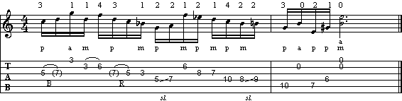 Nella prima battuta troviamo ancora gli stoppati, oltre all'uso degli intervalli di terza minore e maggiore sull'accordo di C a fine battuta.