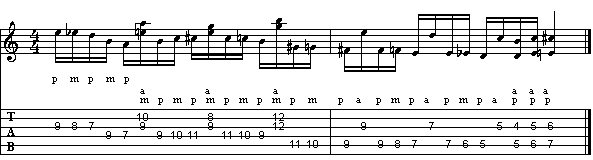 Nella seconda usiamo i salti di corda, per sfruttare gli intervalli di sesta, suonati su 3a e 1a corda.