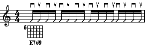 Per concludere questa serie di esempi introduttivi sugli accordi, una ritmica sicuramente più complessa. Seguite rigorosamente la pennata come indicato, fermando la vibrazione delle corde nel momento opportuno.