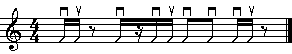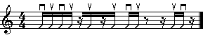 Leggermente più complesso. Infatti, appena suonato il sedicesimo in battere del secondo movimento dovremo fermare il suono per un ottavo e mezzo, e in modo uguale anche sul quarto movimento. Sul terzo movimento, invece, la pausa viene fatta sul terzo sedicesimo: ricordate di fare comunque il movimento della pennata in giù senza suonare, in modo tale da tenere la frequenza ritmica.