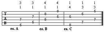 Il problema iniziale che si incontra nell'uso delle ottave è nel capire come ottenere le diteggitaure. Ben sapendo che usiamo una coppia di note ad intervallo di ottava, possiamo adottare innanzitutto tre diteggiature, che vedete nel riquadro sotto. Le prime due (es.A ed es.B), che sviluppano una diteggiatura su due corde con una centrale "muta" (vedremo tra breve perchè), sono quelle che effettivamente useremo. La terza diteggiatura (es.C), sebbene venga usata a livello melodico e solistico, non la prenderemo in considerazione, in quanto non pertinente al lavoro dedicato alle ottave nella ritmica.