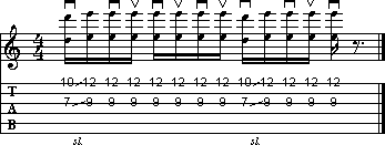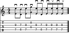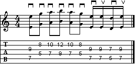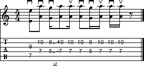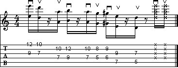 L'esempio a lato è abbastanza complicato. Seguite scrupolosamente la pennata indicata, bloccando la vibrazione delle corde durante le pause. Attenzione alla coppia di sedicesimi in stoppato finali, che potrebbero dare dei problemi mettendo in successione la battuta dell'esercizio in quanto cadono immediatamente sul battere successivo ad ottave.