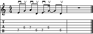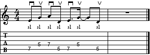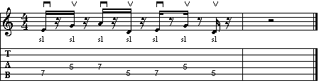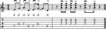 Conviene subito sviluppare il riff con l'utilizzo della pennata slap, in modo da renderlo subito più interessante sotto l'aspetto ritmico. In questo modo tutte le note risulteranno "staccate", e quindi più percussive.