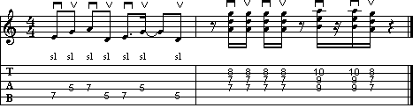 La ritmica base, come già detto, prevede un semplice riff in E(sus), basato sulla scala pentatonica minore, che ben si presta a diverse interpretazioni armoniche. Questo riff lo sviluppiamo su quinta e quarta corda. Come prima versione analizziamo la semplice ritmica: