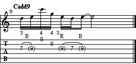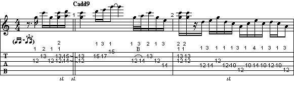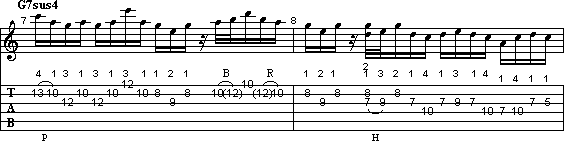 Si finisce con il classico bending e release in pieno stile country, che sulla terza corda porta la nota D a E (bending), a D (release) e di nuovo a E (bending), mentre sulle prime due corde un barrè del dito mignolo ci consente di suonare le note C (prima corda) e G (seconda corda). Ricordate di mantenere premuto il mignolo dopo avere suonato le prime due corde.