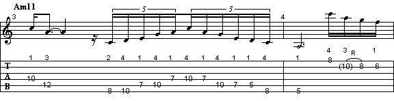 Un altra pentatonica di C maggiore la troviamo nella seconda parte di battuta 3. Sul quarto movimento della battuta successiva abbiamo un altro lick tipicamente country, formato da un release della nota A che scende a G. Per ottenere l'effetto del release, il terzo dito aveva precedentemente tirato la seconda corda all'ottavo tasto. Questa frase introduce l'accordo seguente.