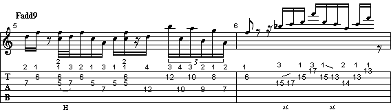 In battuta 6 troviamo un interessante utilizzo verticale della linea melodica, che risalta in particolare grazie all'uso sia degli slide che, appunto, degli intervalli ampi dati dalla verticalizzazione di alcune note. Il tutto sempre sulla pentatonica di F.