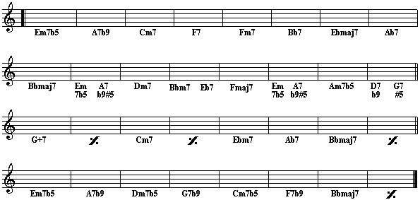 cioè la linea melodica, mentre gli altri servono per lo sviluppo dei soli. Dando per scontata la linea melodica (cioè il tema, che potete comunque ascoltare nella base midi), reperibile, come già detto, sul Real Book o altre pubblicazioni,