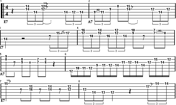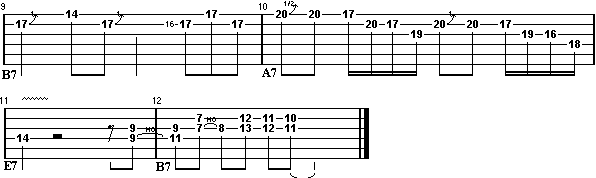 Nella parte finale della battuta inizia la frase che si collega all'accordo di B7 seguente, caratterizzata da una terzina dove la prima nota (il E sula 2a corda al 17° tasto) viene tirata con l'anulare in bending di un tono (fino al F#), alla quale seguono altri due F#, suonati con il dito indice sulla 1a corda al 14° tasto.