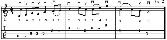 sul settimo tasto. La nota successiva, cioè il E, viene suonata normale. La sonorità di una nota eseguita con la legatura ascendente (e, come vedremo subito, anche con quella discendente),