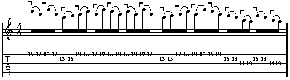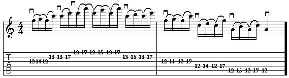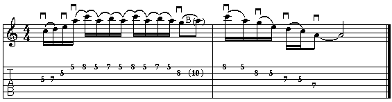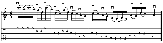 Tipica frase che inizia con la pennata sweep per poi legare sulla prima corda una successione di note in quinta posizione, concludendo