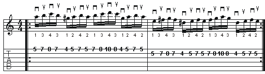 In questa sezione ci occuperemo della coordinazione delle due mani. L'importanza di questa serie di esercizi è vitale per il perfetto controllo della mano destra in contemporanea ai movimenti che dovrà operare la mano sinistra sulla tastiera. Non dimentichiamo anche un fattore importante: mentre le due mani sono addette a determinati movimenti, dovremo anche pensare alle note che dobbiamo suonare, e quindi impegnare ulteriormente le nostre risorse celebrari, già duramente provate dal controllo delle diteggiature e delle pennate. Il consiglio è di suonare questi esercizi in successione e ad una velocità rigorosamente bassa, imparandoli a memoria e suonandoli con regolarità tutti i giorni. E' indispensabile l'abitudine quotidiana all'esercizio, specialmente chi è all'inizio, anche se non si deve sforzare oltre al dovuto. Nel momento stesso in cui si notano dolori muscolari o affaticamento della mano, fermiamoci qualche istante, cercando di rilassare gli arti. Ma anche il cervello ha bisogno di riposo, e quindi stacchiamo ogni tanto, magari appoggiando la chitarra e facendo due passi. Esercizio 1 La parte fondamentale di questa sezione di studio si risolve nell'impadronirsi perfettamente della tecnica in questo esercizio, in quanto, una volta assimilato il procedimento relativo all'esecuzione, si avranno le basi pratiche per l'analisi e lo studio di tutta la serie di esercizi a seguire. Chi nutre dei dubbi sul corretto uso della tecnica inerente alla pennata alternata, può consultare l'apposita sezione che tratta appunto l'apprendimento della pennata alternata. In questa pagina viene anche spiegato il corretto uso delle dita della mano sinistra, che devono in molti casi rimanere pigiate per fluidificare la successione delle note. Vediamo quindi il primo esercizio. ![]()