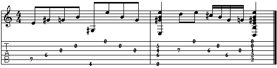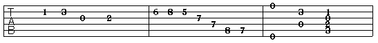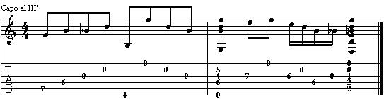 Osservando gli esempi riportati, potrete notare come nel primo caso la parte venga suonata con la chitarra in accordatura normale, con la relativa intavolatura coincidente come tasti.Nel secondo caso la stessa parte, suonata con il capotasto al 3° tasto, traspone ovviamente le note sul pentagramma, ma l'intavolatura rimane invariata: infatti, le corde a vuoto sono ora quelle al 3° tasto e di conseguenza ogni tasto letto sull'intavolatura deve in realtà essere suonato tre tasti avanti.