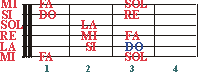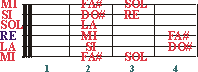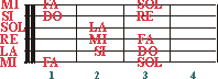 (5a corda, 2° tasto), LA (5a corda a vuoto), SOL (6a corda, 3° tasto"), FA (6a corda, 1° tasto") e infine MI (6a corda a vuoto).