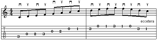 è quello di suonare a tempo, utilizzando anche la pennata alternata. Nell'esempio sotto, potete vedere una parte della scala suonata ad ottavi raddoppiando le note. In questo modo avete più controllo dell'esecuzione.