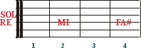 (2a corda, 3° tasto), MI (1a corda a vuoto), FA (1a corda, 1° tasto") e SOL (1a corda, 3° tasto").