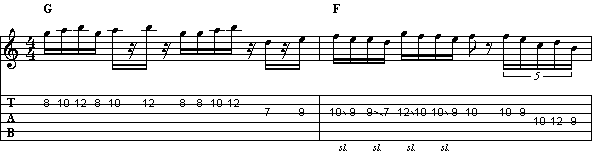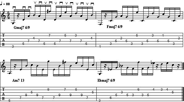 Torniamo al modo di F lidio, iniziando con un classico dello strinng-skipping basato sull'arpeggio delle note dell'accordo di F. Questo fraseggio è reso difficile dalla divisione ritmica a sestine, che comporta un uso particolare degli accenti. Un consiglio: suonate la frase pensando al tempo in ottavi piuttosto che in quarti. In questo modo è possibile valutare la divisione non più a sestine ma a terzine, con conseguente semplificazione della linea ritmica.