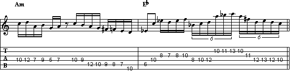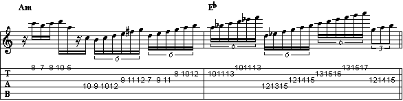 Sull'accordo di A minore è utile suonare la scala di A minore, anche se si contrappone alla linea armonica del riff di base, che presenta in questo punto un F# tra le note del riff stesso. La tonalità di A minore lega meglio con il precedente accordo di F e il successivo Ebmaj7.