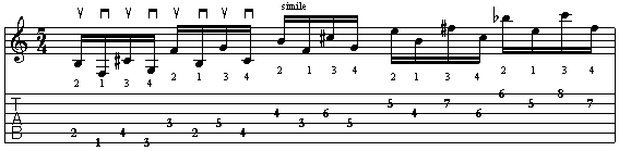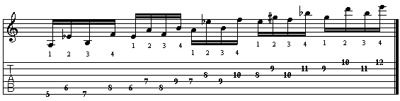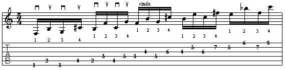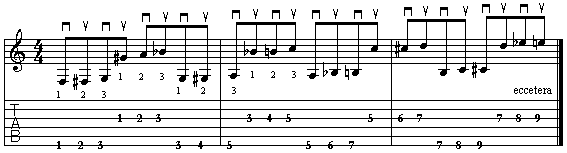 e avanzando di un tasto (e di una corda) ogni quattro note. Pennata alternata obbligatoria.