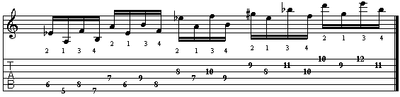 Nel primo esercizio ci troviamo a lavorare su sesta e quinta corda, con una serie di note suddivise in gruppi da tre per corda. Con questo sistema è facile notare come