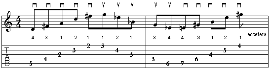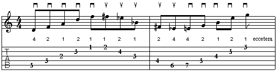 (quinta corda, quinto tasto), e quindi l'arpeggio che viene ad essere sviluppato è una arpeggio in D maggiore. Se spostassimo la diteggiatura in