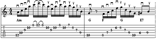 suonati in battere su ognuno dei quattro movimenti della seconda battuta. Sull'accordo di Am viene ad essere suonato un arpeggio sulla triade minore di A e, sull'ultimo