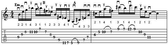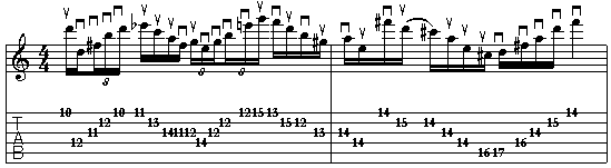 Nella seconda battuta, vengono arpeggiate in sweep due sequenze di note che concidono con l'accordo di F (secondo movimento) e di nuovo G (terzo movimento). Le note G# e B suonate ad ottavi