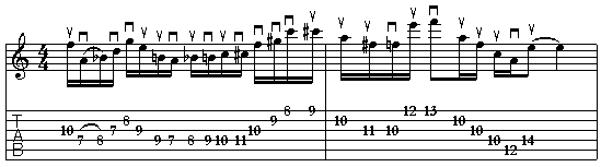 Una frase jazz da suonare su Fmaj7, che comprende alcune note out. Come vedete, il sistema di pennata è abbastanza