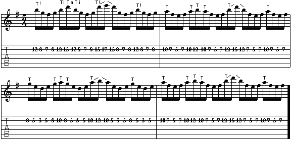 in questo specifico caso, sulla scala di G maggiore. L'ultima nota G viene suonata in tapping dal dito indice.